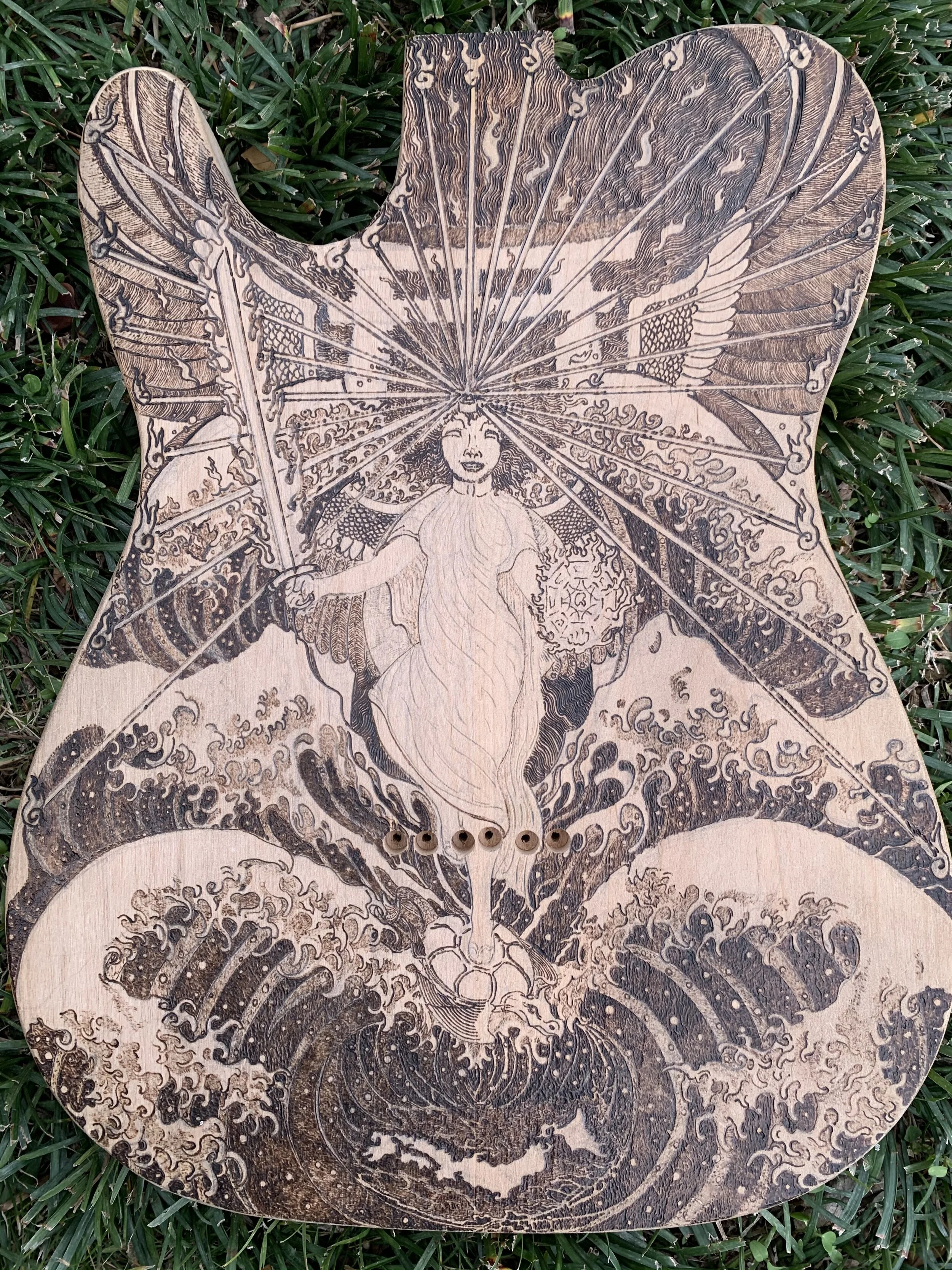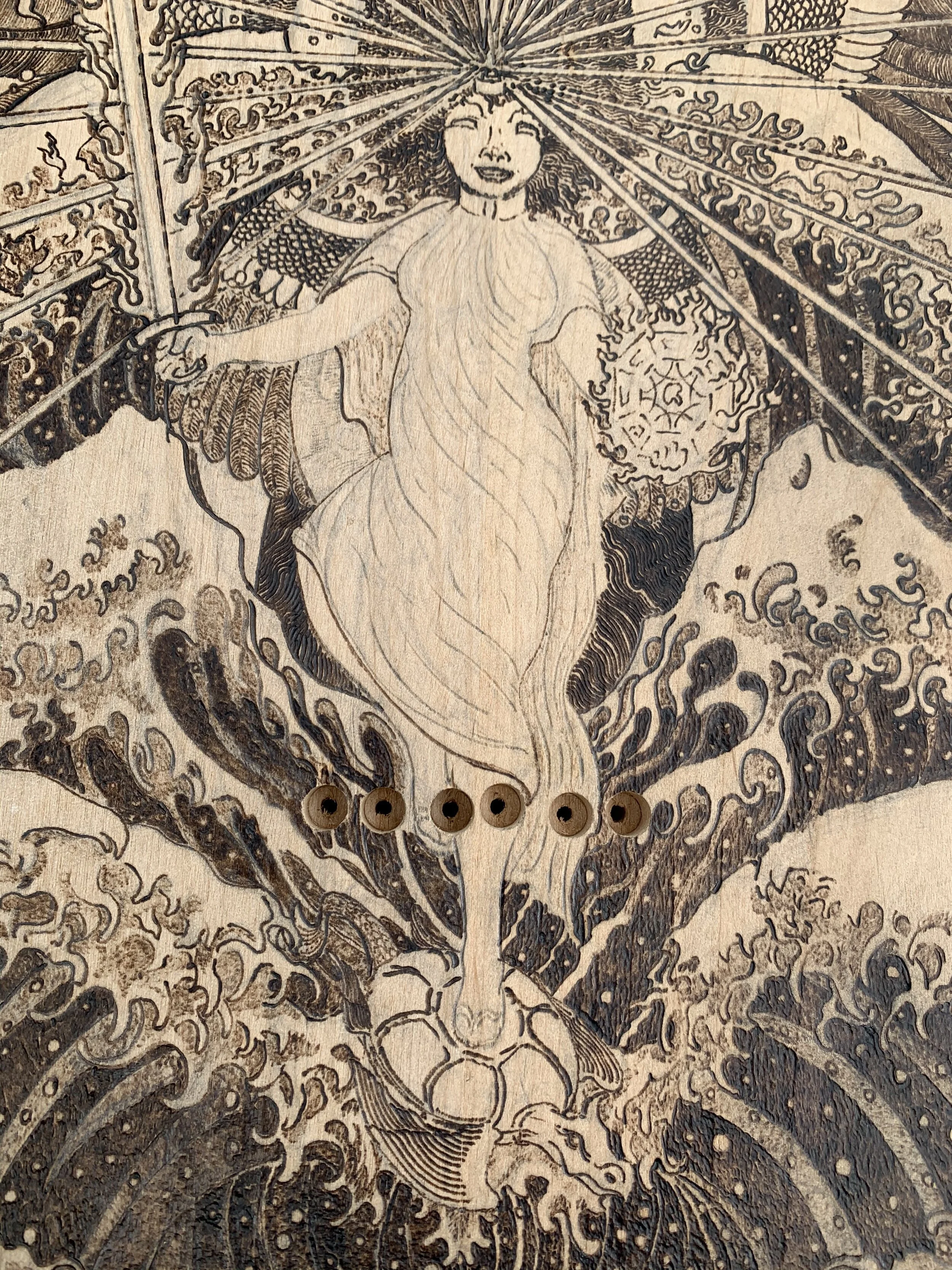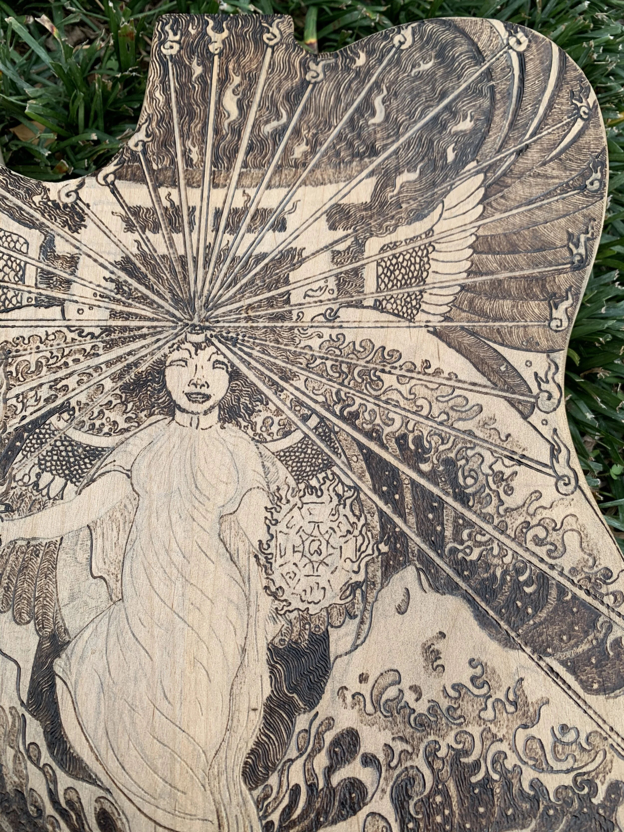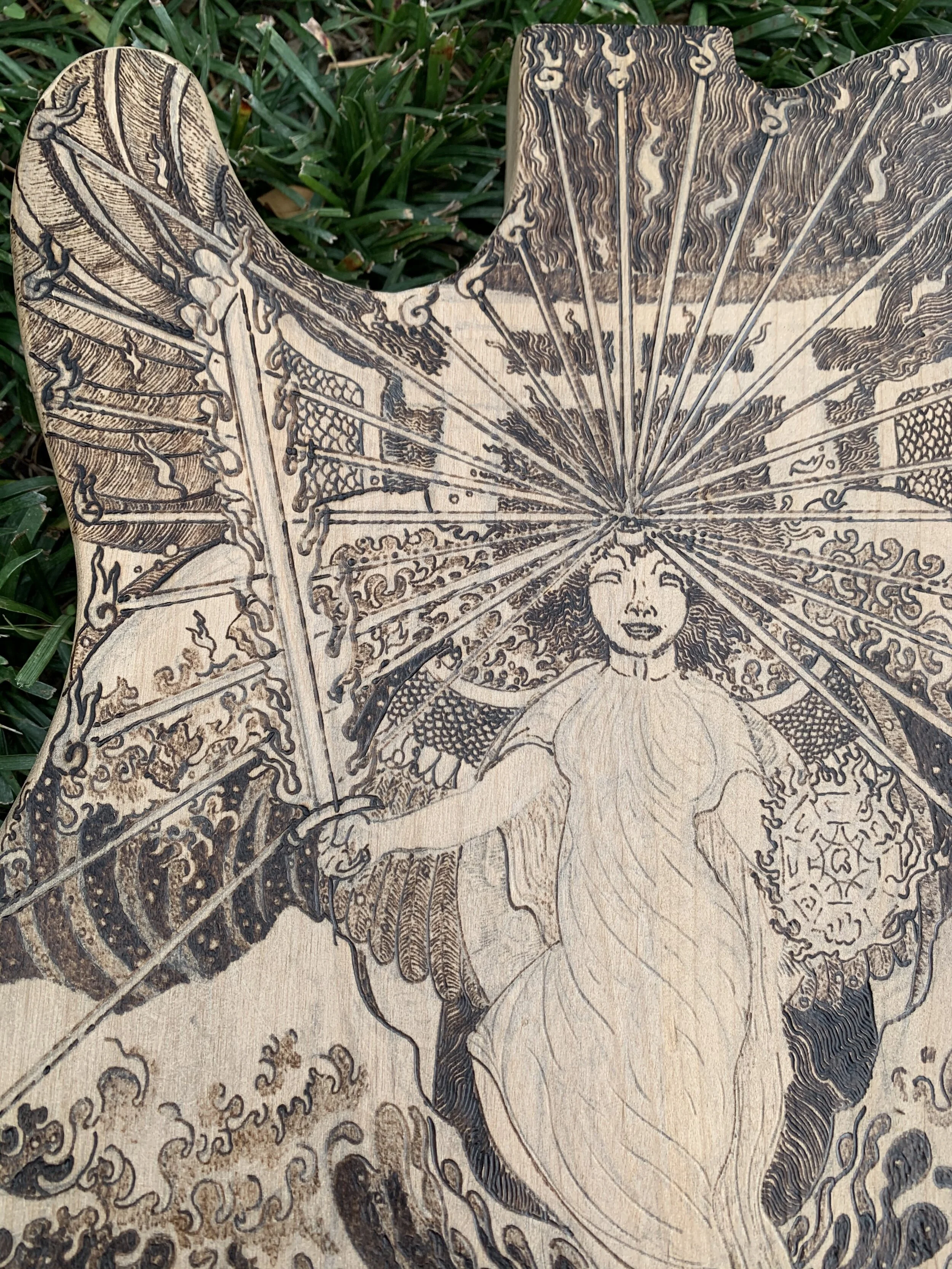 The back is a riff on the algorithms of the Great Wave, here framing a vision of the Divine Ameratsu, Our Lady of the Sun, standing above the Sea of Japan. She carries a mirror, a wish-granting jewel, and a sacred sword, and hovers before a cosmic Torii gate.
