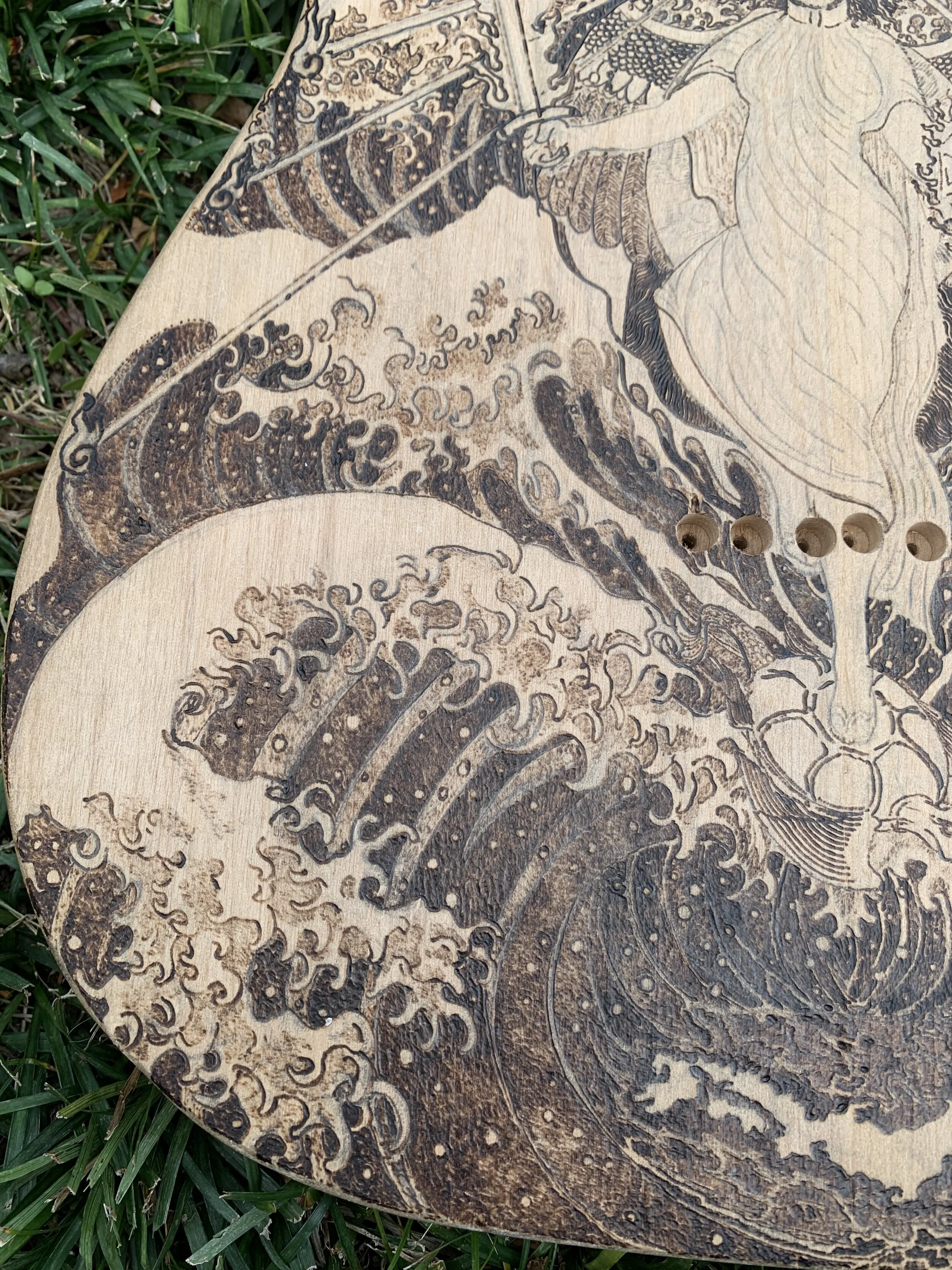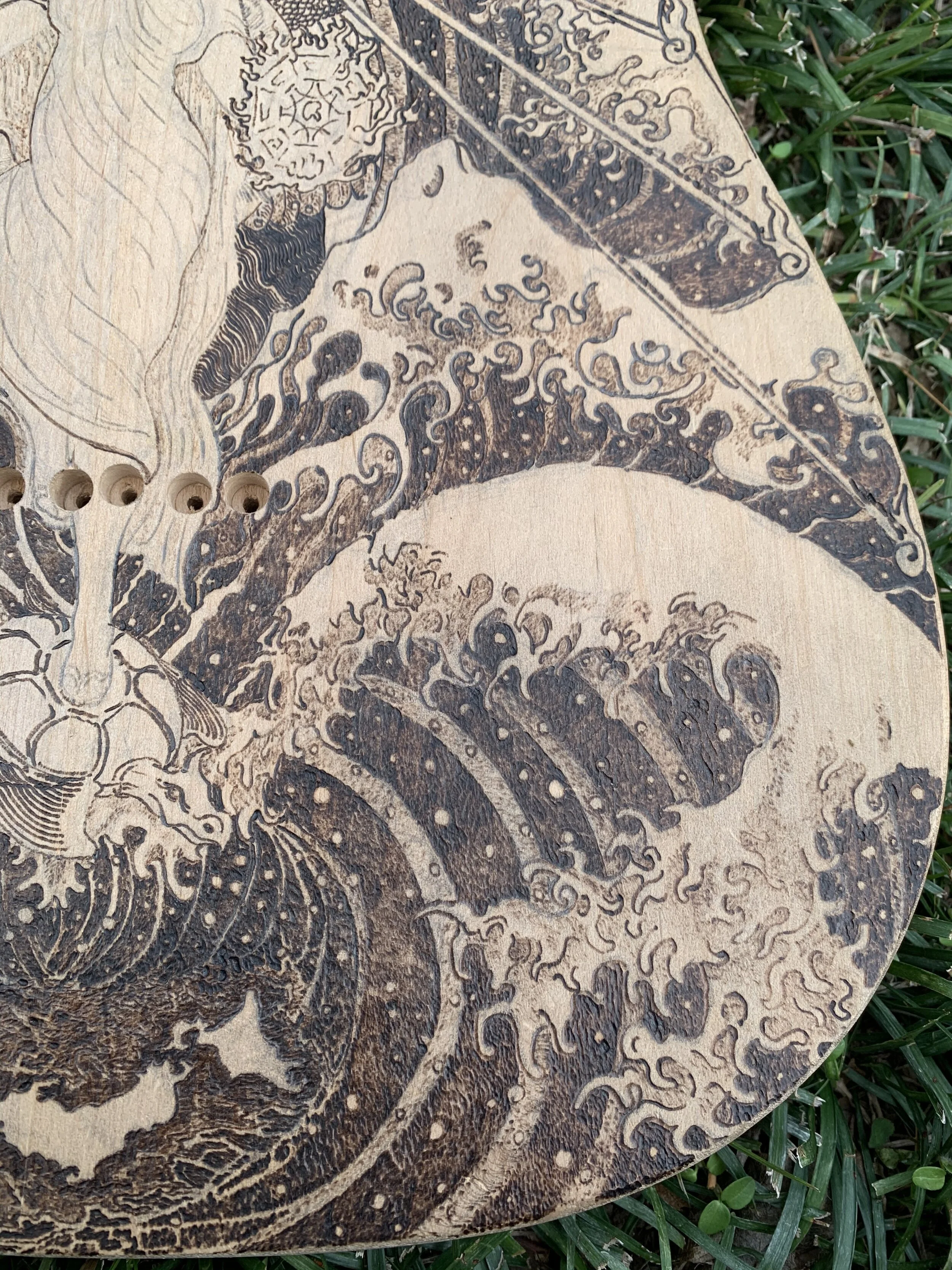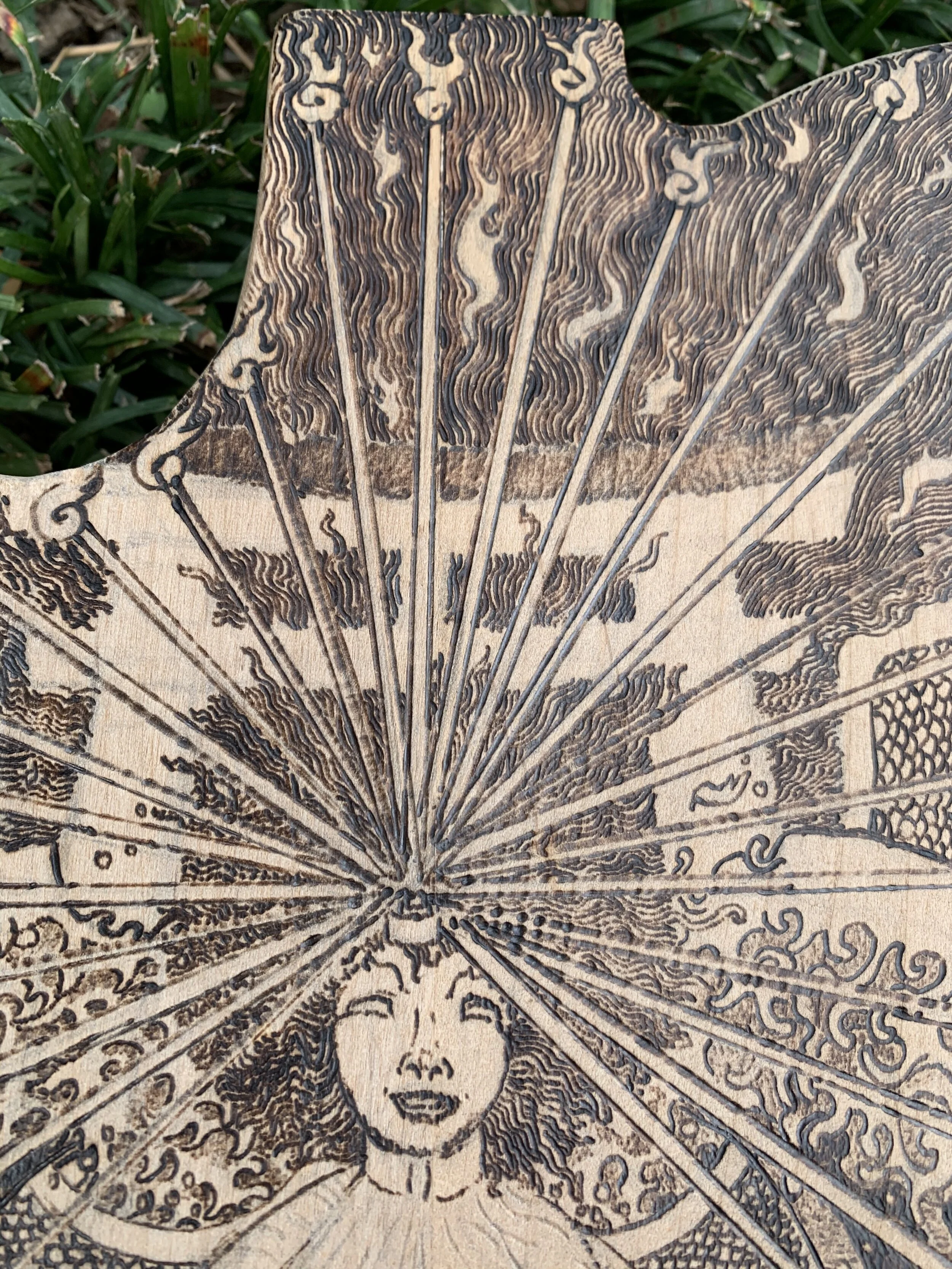 The back is a riff on the algorithms of the Great Wave, here framing a vision of the Divine Ameratsu, Our Lady of the Sun, standing above the Sea of Japan. She carries a mirror, a wish-granting jewel, and a sacred sword, and hovers before a cosmic Torii gate.