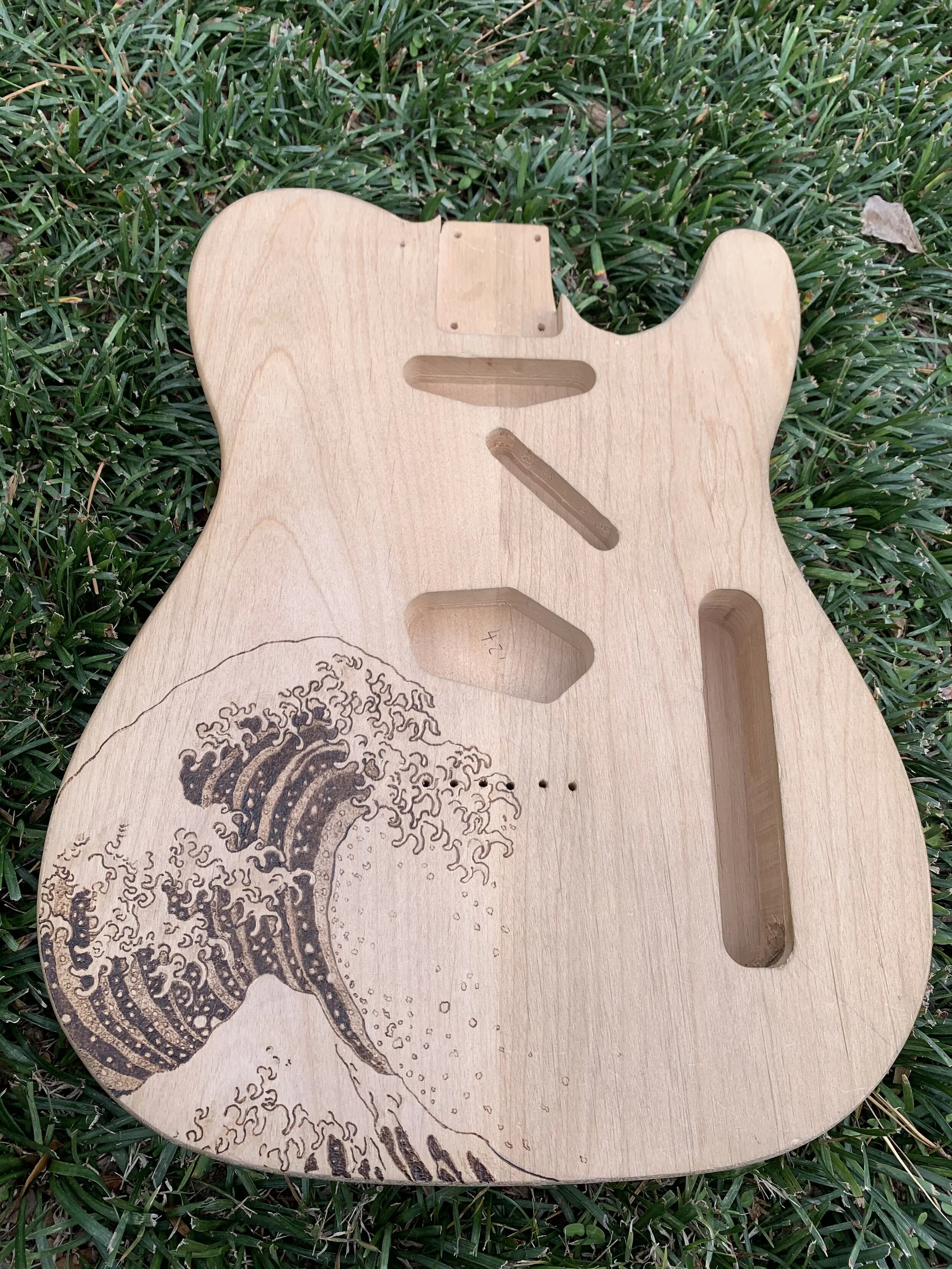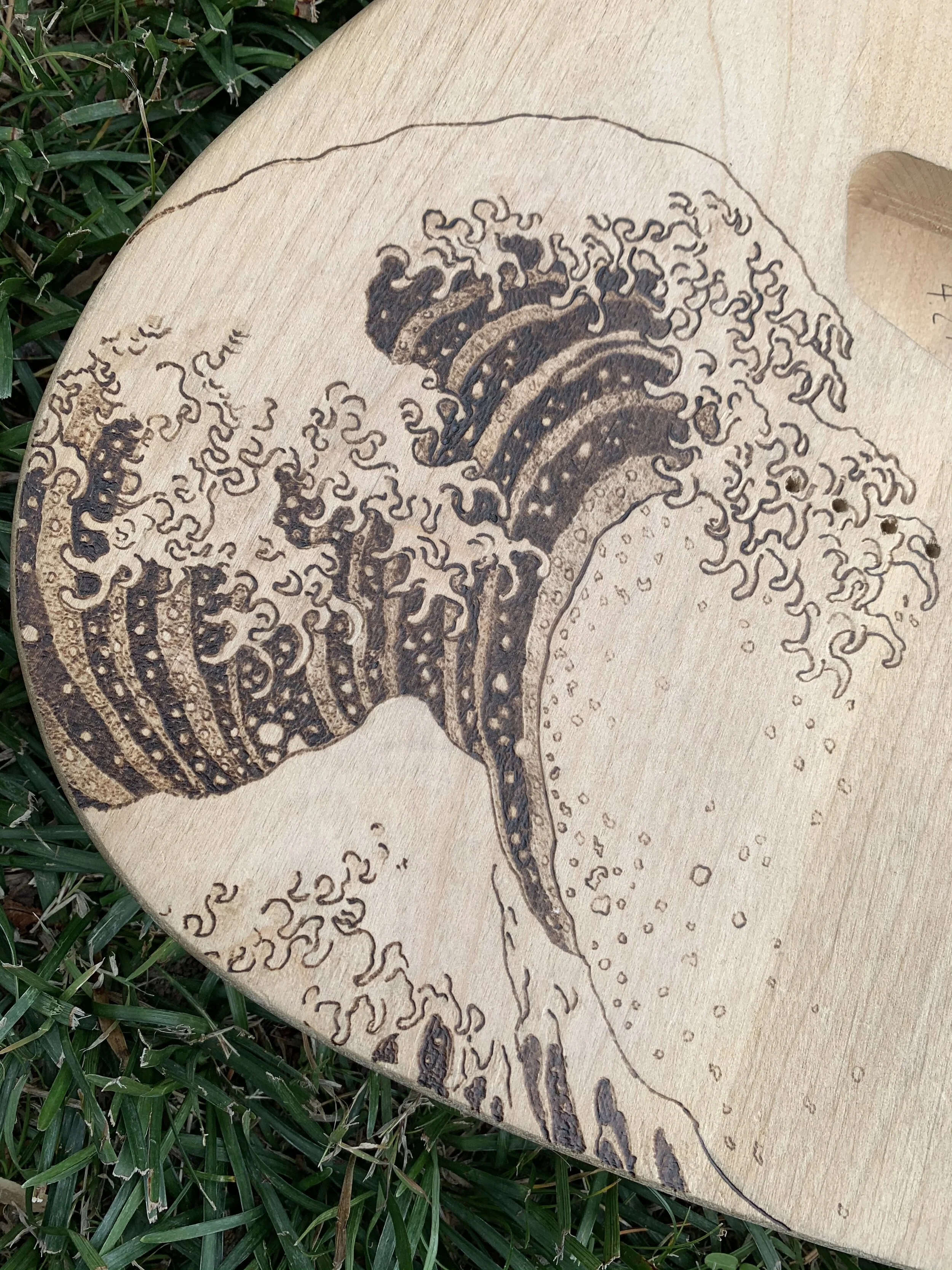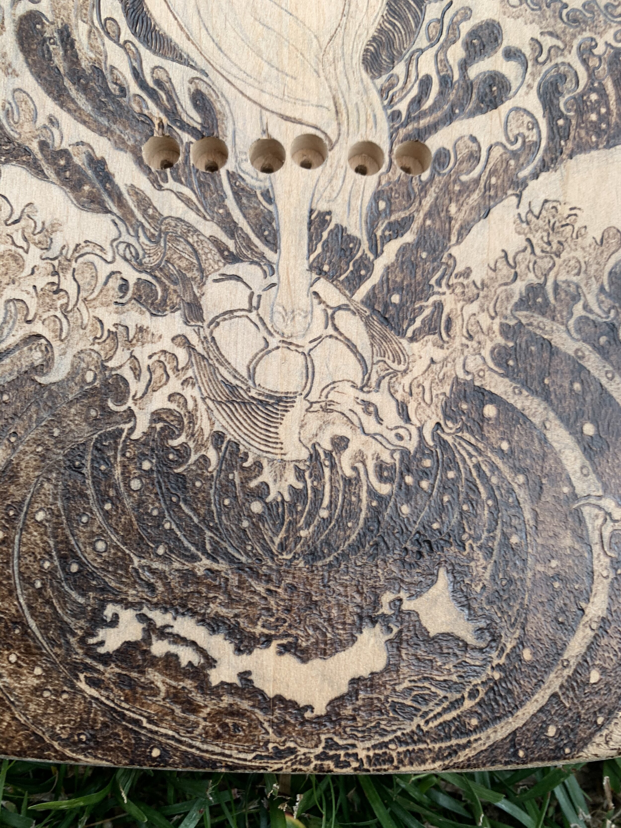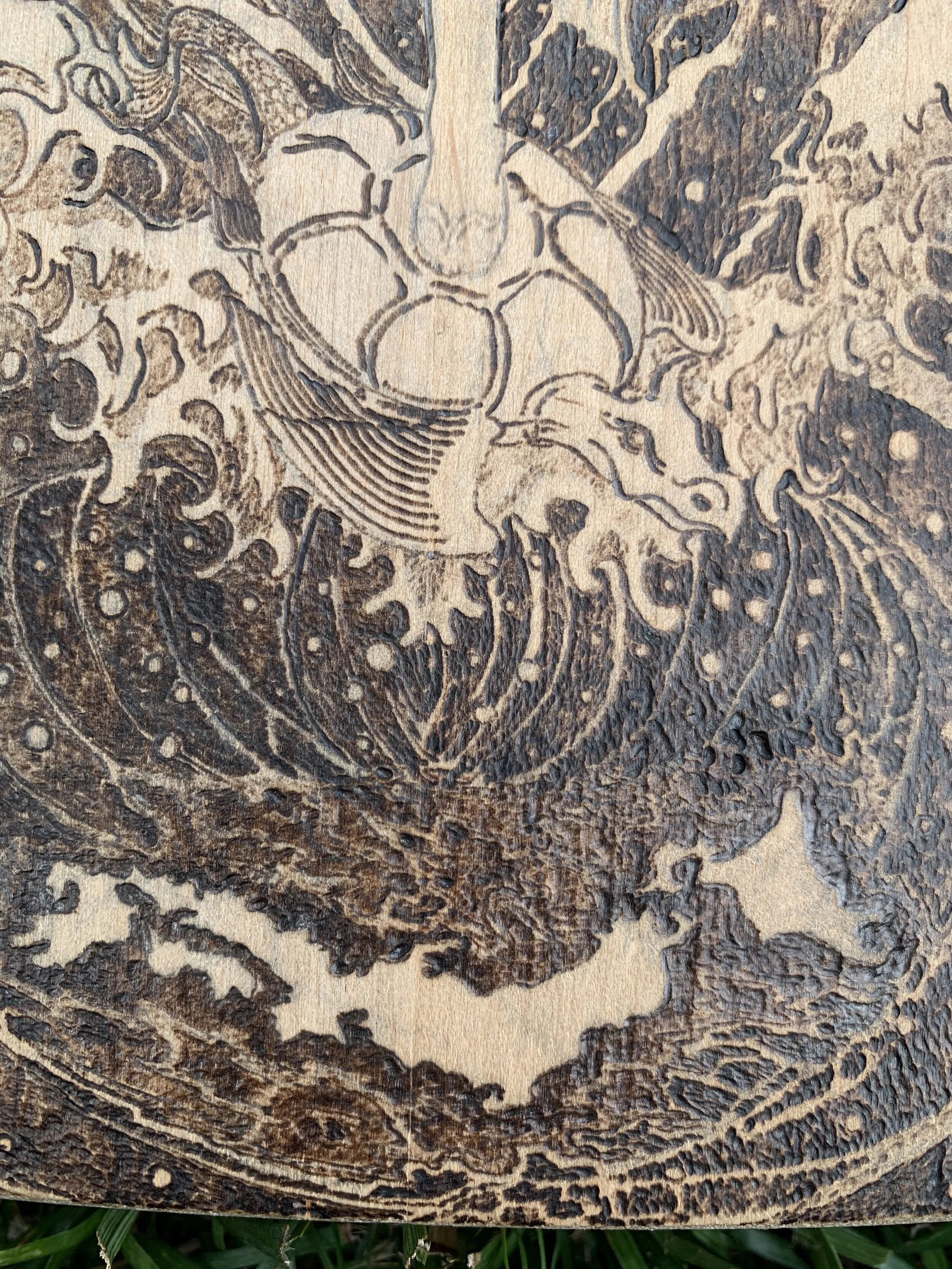 The back is a riff on the algorithms of the Great Wave, here framing a vision of the Divine Ameratsu, Our Lady of the Sun, standing above the Sea of Japan. She carries a mirror, a wish-granting jewel, and a sacred sword, and hovers before a cosmic Torii gate.